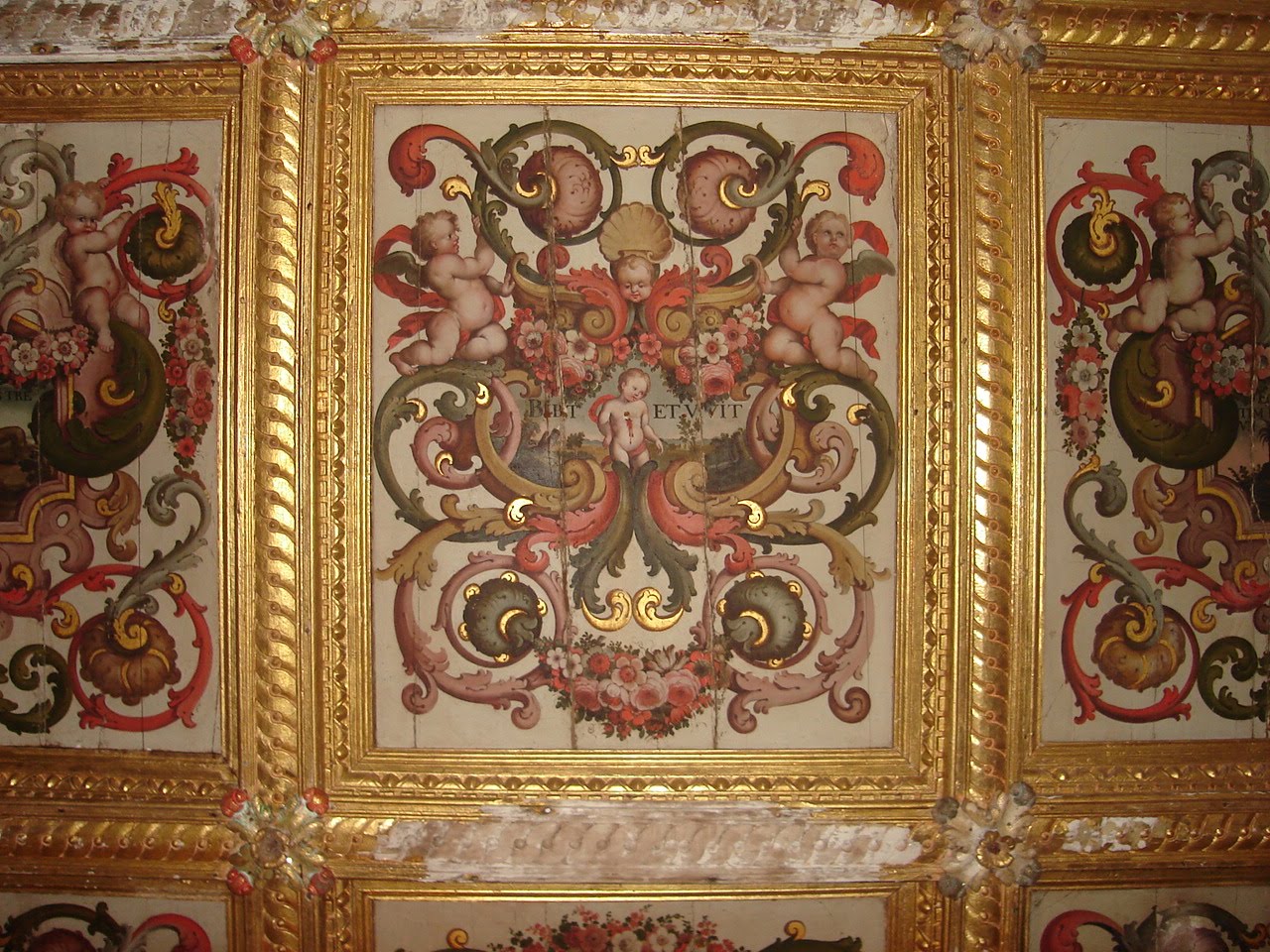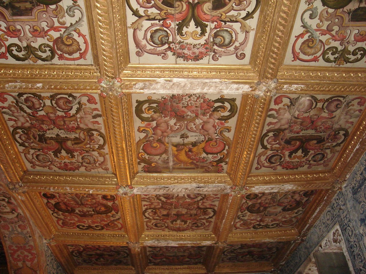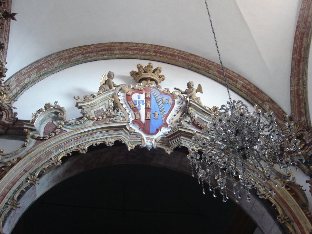 ...acompanhados por uma lenda em latim na madeira polida e policromada. As características do tecto pertencem ao Barroco Joanino, que é uma produção artística ao longo do reino de D. João V.