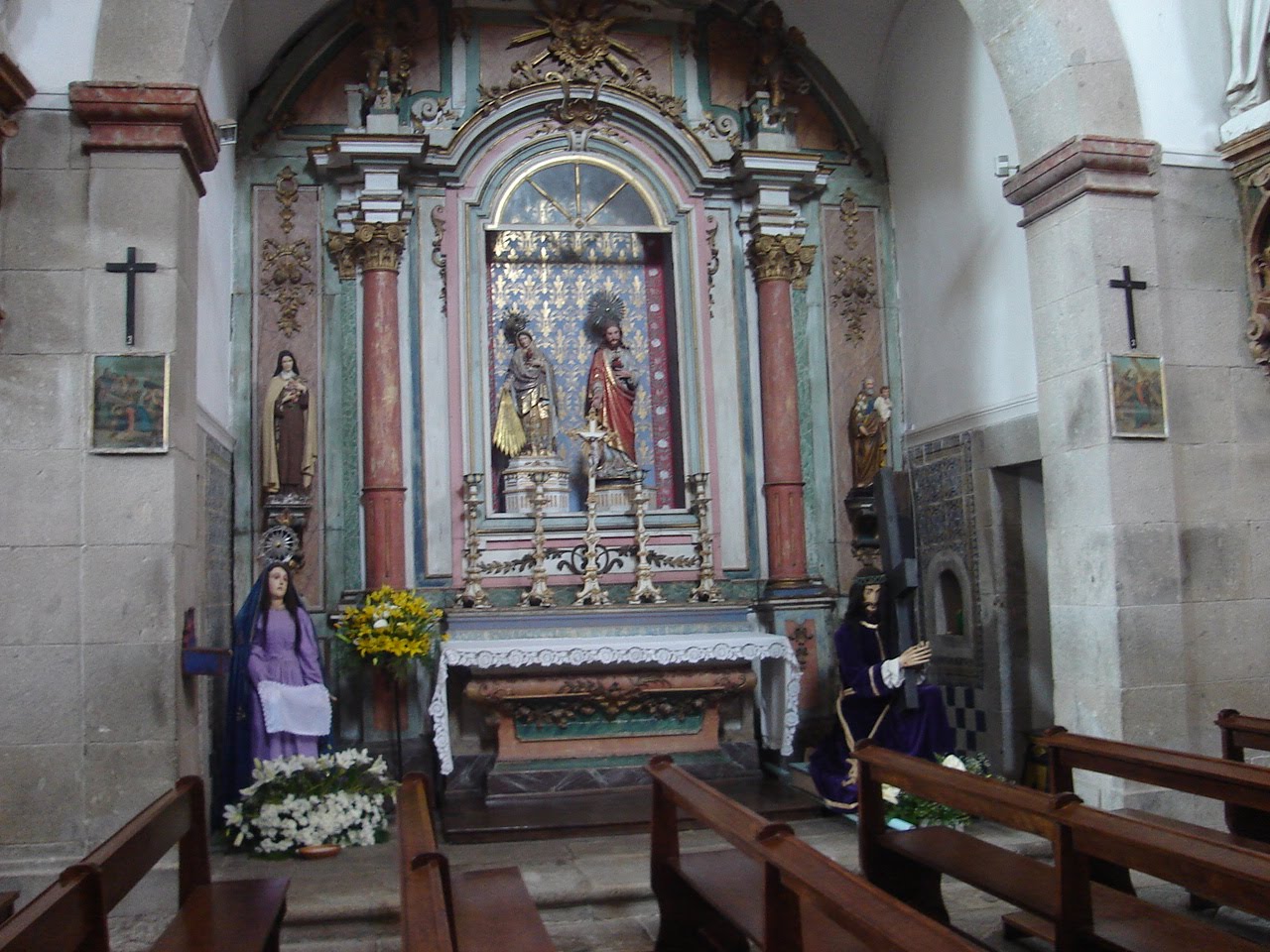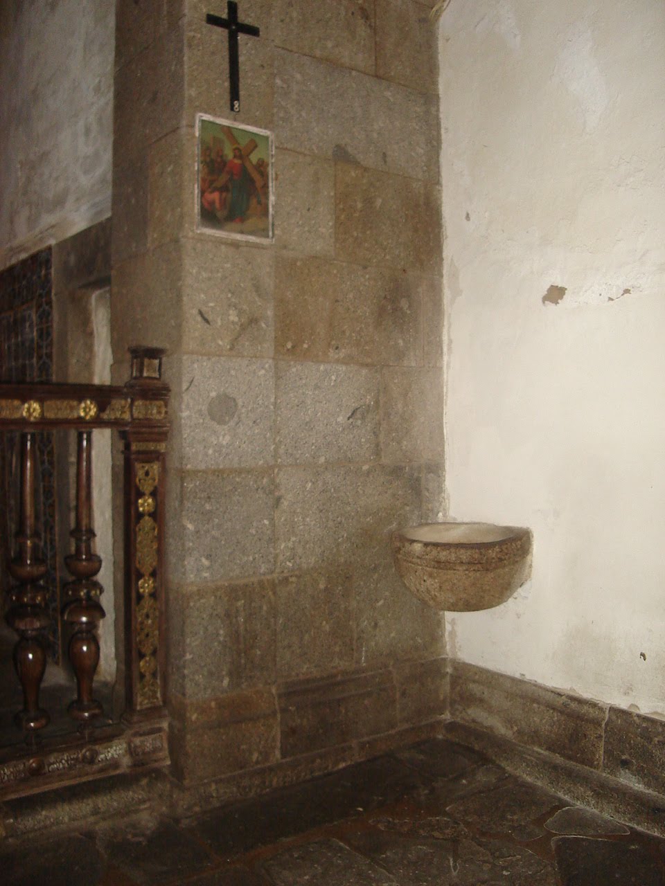 No falso transepto, decorado com azulejos do século XVII, encontra-se uma pia de água benta românica, proveniente da igreja primitiva.