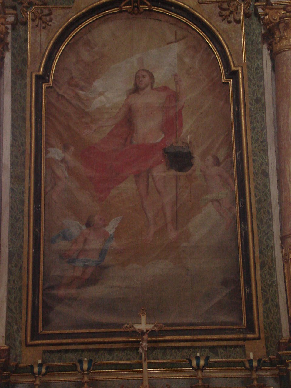 A nave central esquerda apresenta uma tela com Cristo ressuscitado acompanhado por putis e segundo a iconografia sacra a ressurreição de Cristo representa a fé e a esperança.