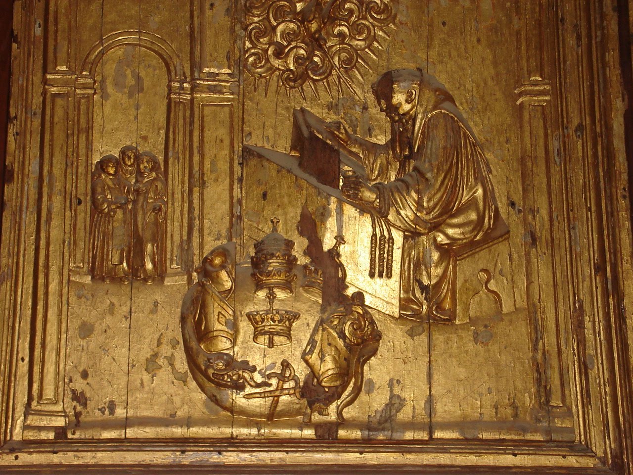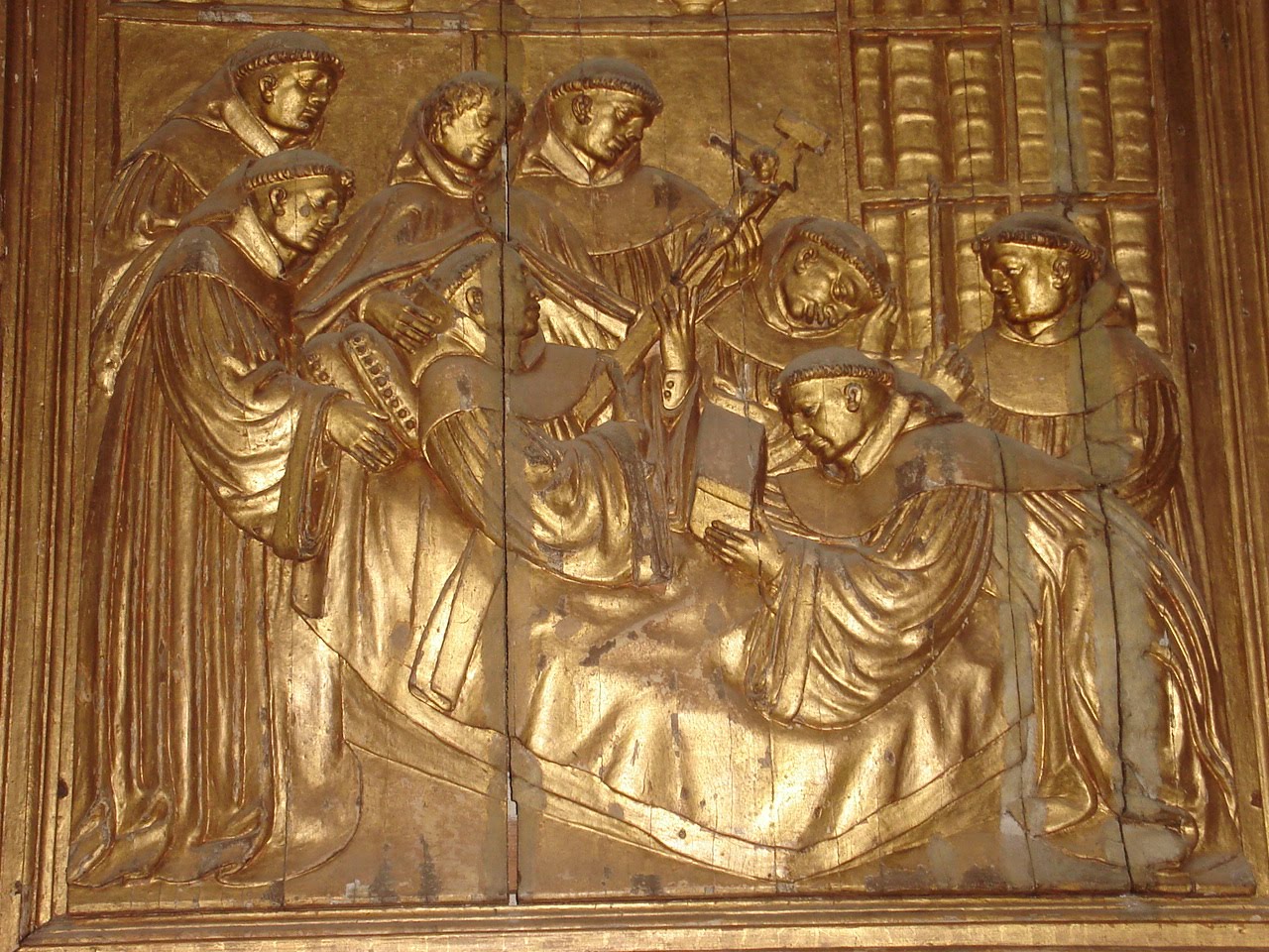 Na parte superior do cadeiral apresentam-se painéis de talha dourada de grande qualidade artística. Nos painéis da esquerda narram-se episódios da vida de S. Bernardo enquanto os da direita representam os de S.Bento.