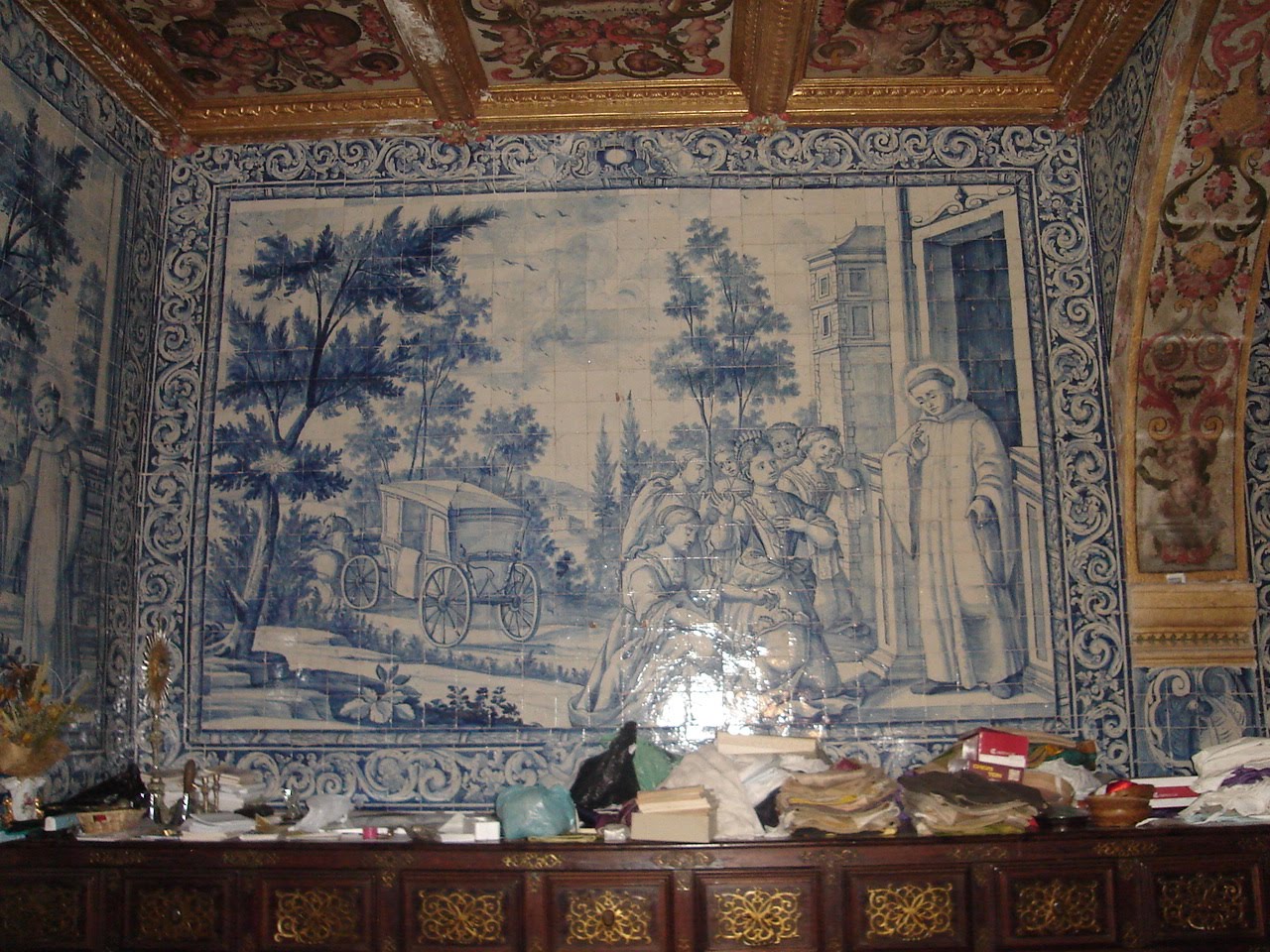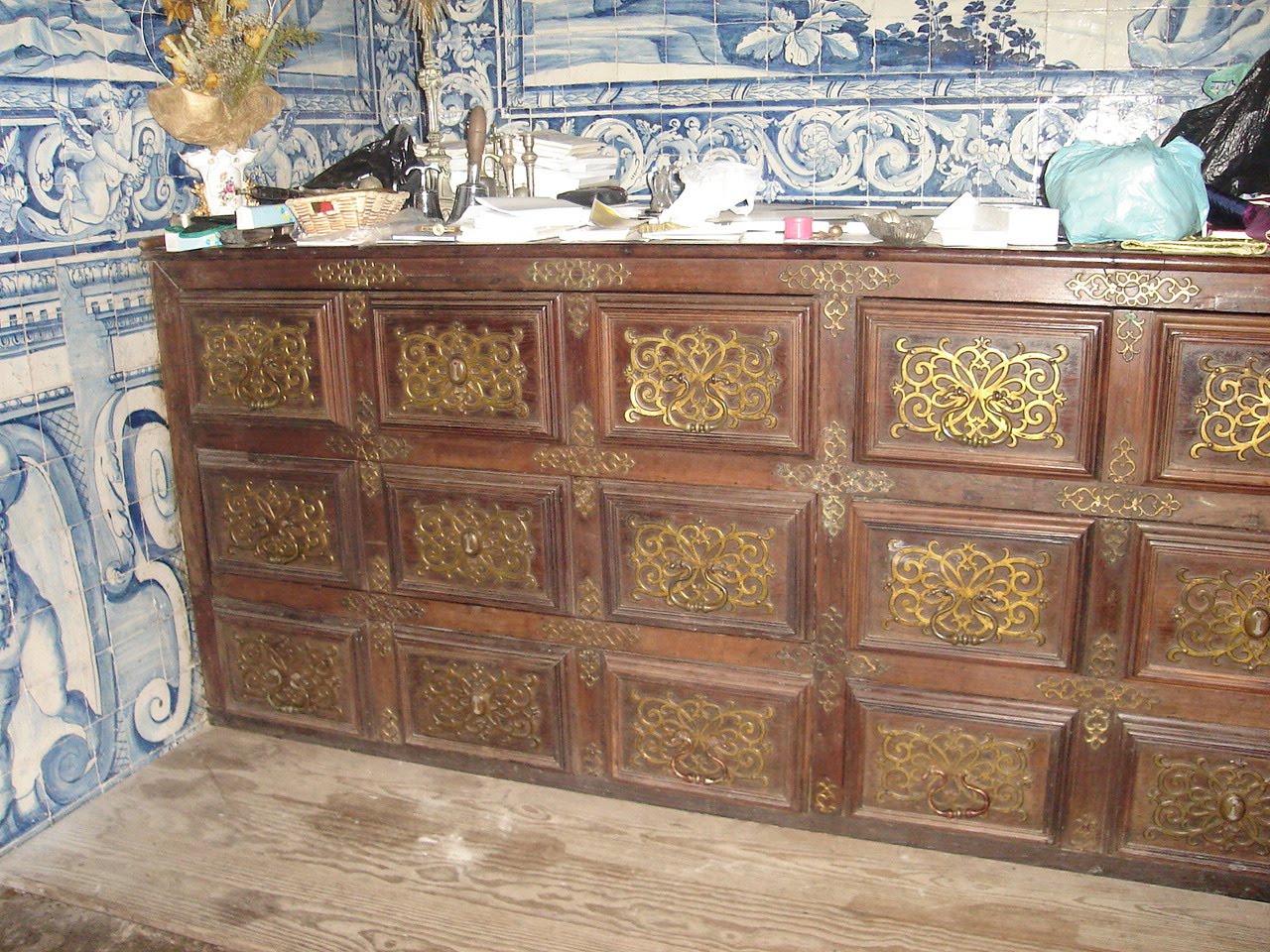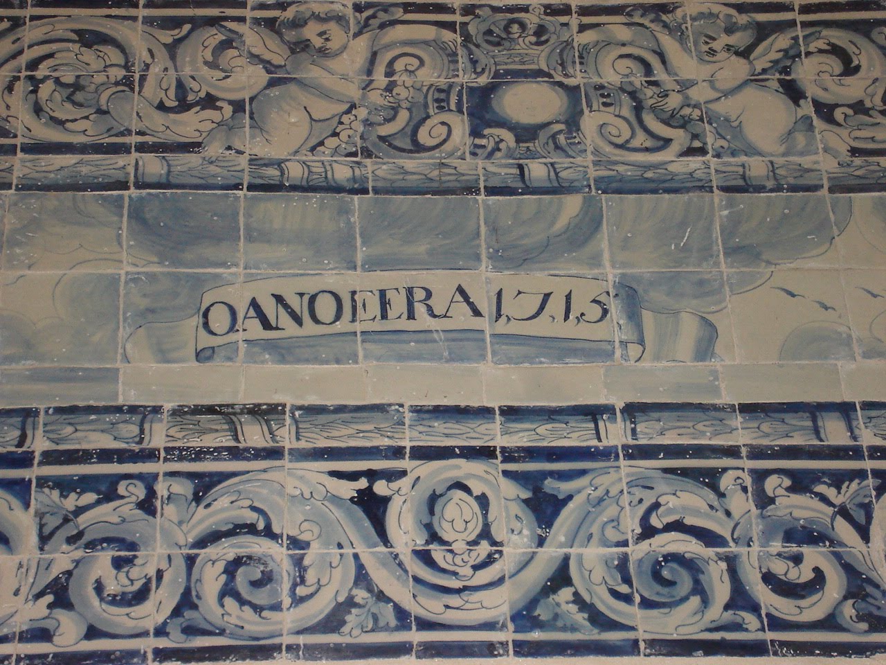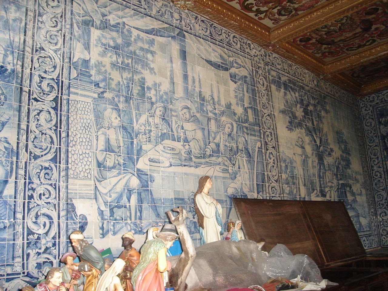 A sacristia da Igreja, datada de 1715, é revestida de azulejo azul e branco do século XVIII.