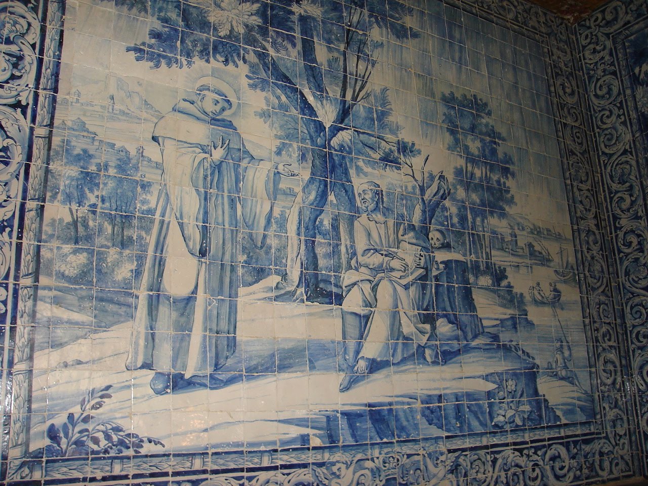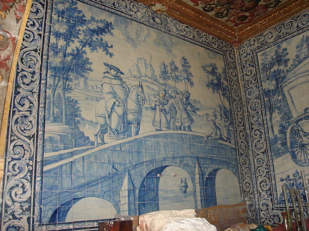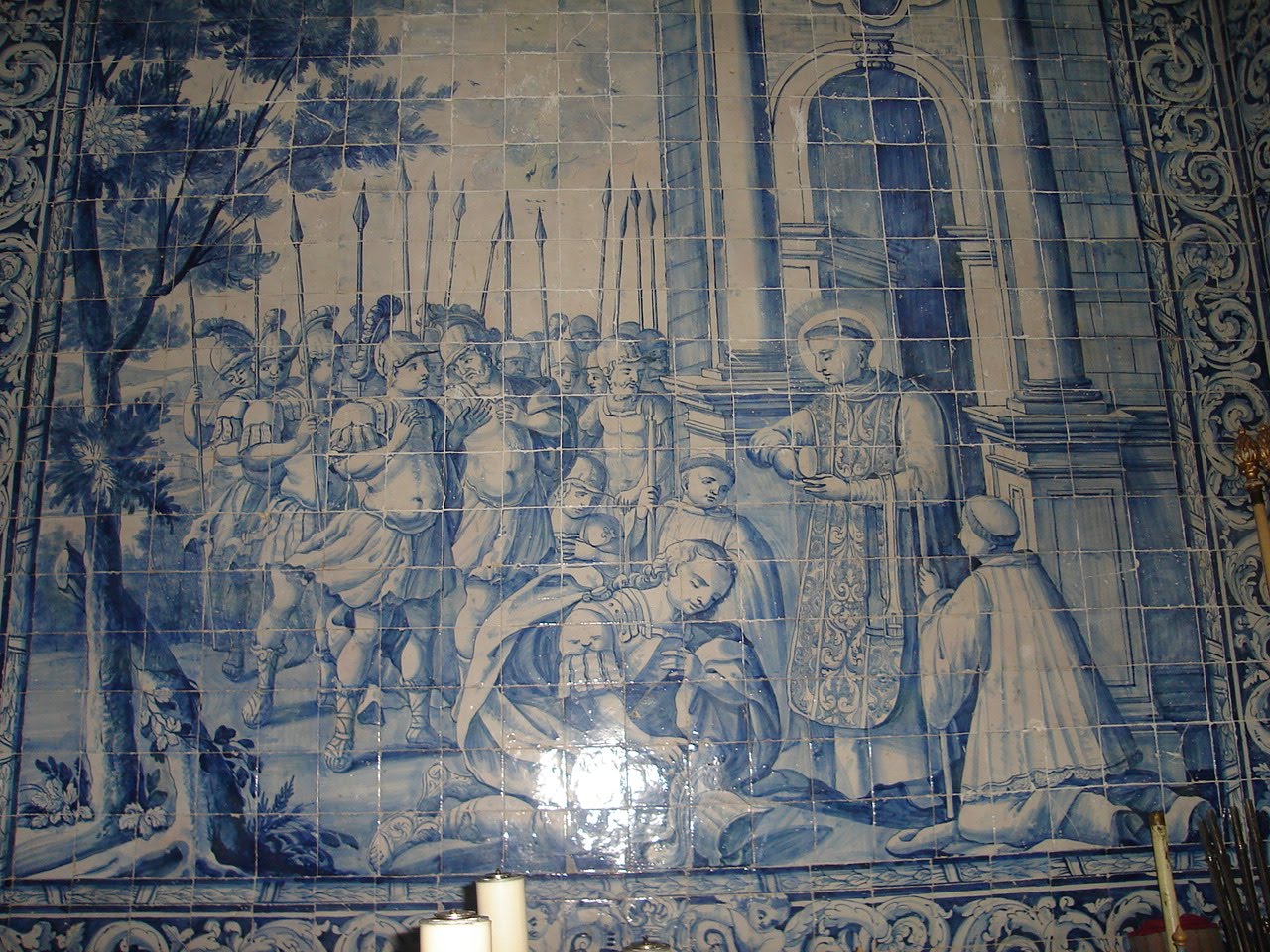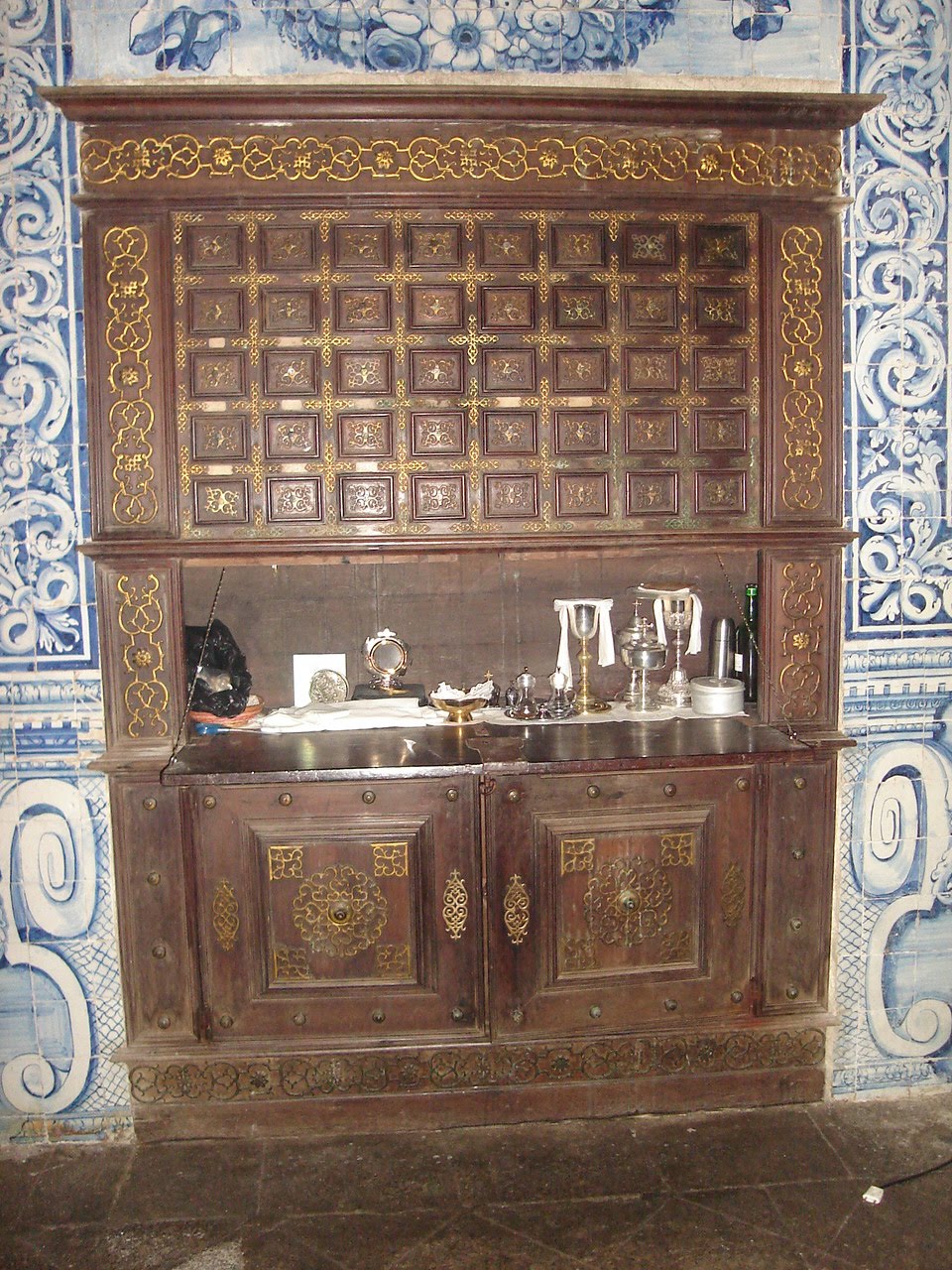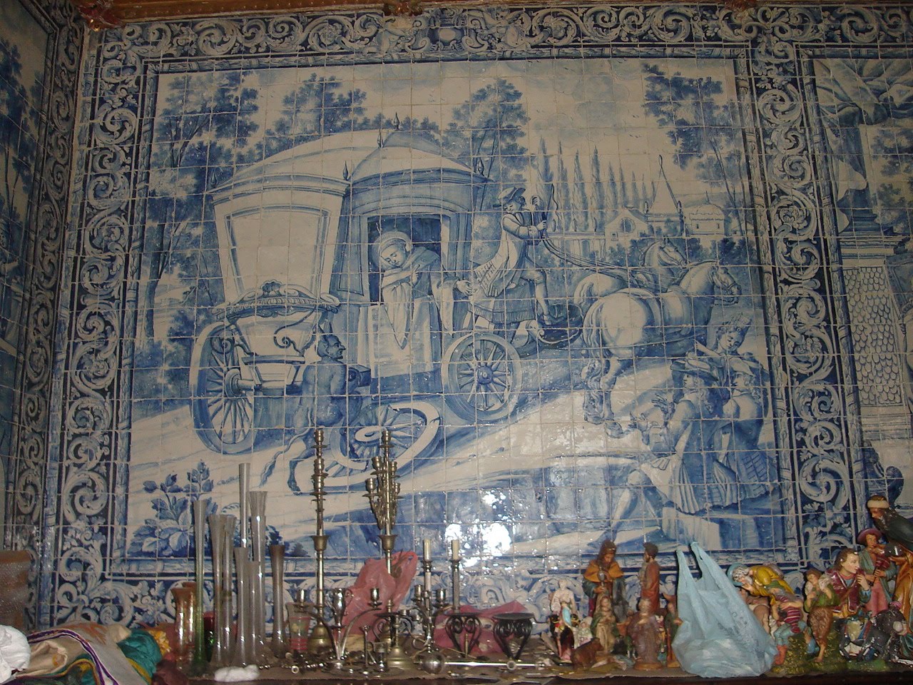 A sacristia da Igreja, datada de 1715, é revestida de azulejo azul e branco do século XVIII.