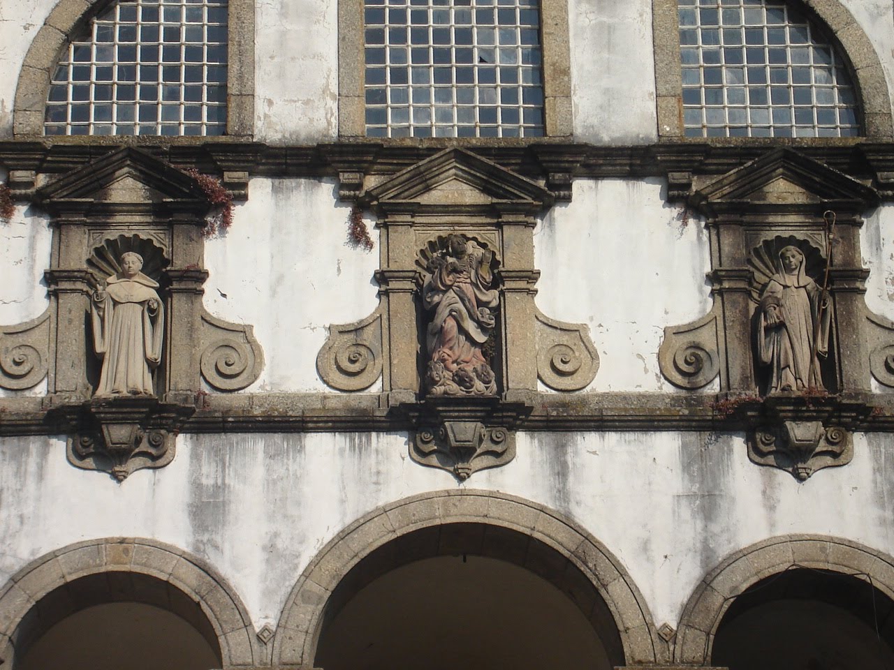 Por cima dos três arcos apresentam-se três nichos (pequenas aberturas esculpidas na parede) onde se encontram três santos de escultura barroca. Os nichos têm como finalidade honrarem os santos ou heróis neles presentes para o exterior dos monumentos, afim de ser visível ao público. No nicho esquerdo encontra-se S. Bernardo, no do centro a Virgem Maria, no da direita S. Bento. Os tectos são em forma de concha de vieira. Estas esculturas são esculpidas na perfeição e verifica-se o exagero do barroco pelos ondulados das roupas. Por cima dos nichos encontram-se frontões esculpidos na pedra de forma triangular que decoram a fachada principal, sendo constituídos por duas partes essenciais: as cimalhas (bases) e as empenas (os dois lados que fecham os triângulos). Estes triângulos têm uma importante simbologia utilizada no barroco. Trata-se do símbolo da trindade como signo do Pai, do Filho e do Espírito Santo. Por baixo dos nichos, a pedra esculpida forma linhas e redondos perfeitos.