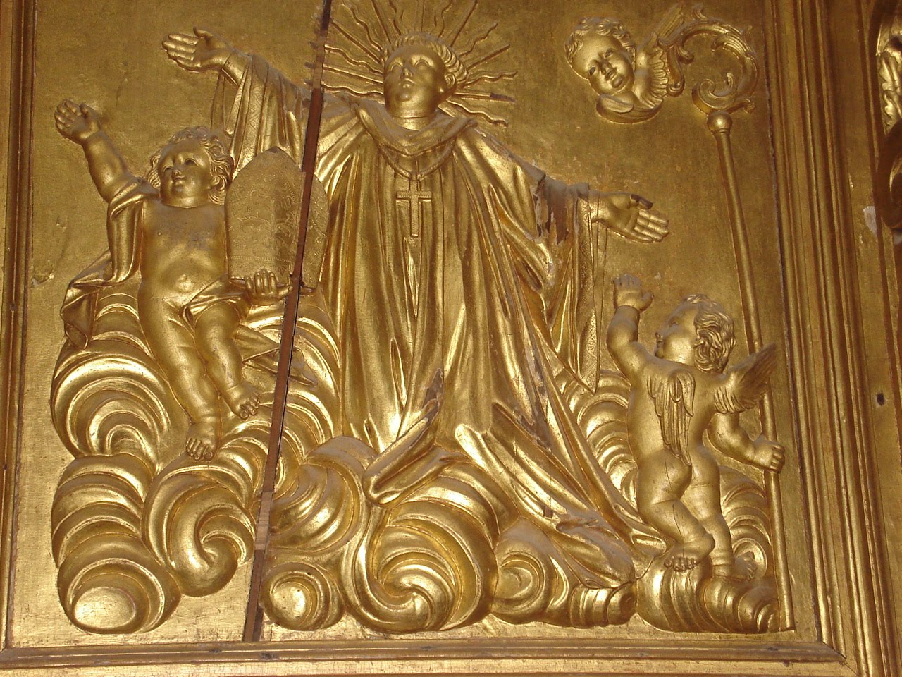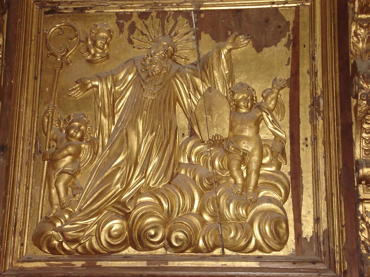 Assim, temos do lado direito S. Bento rezando a Cristo que o chama;