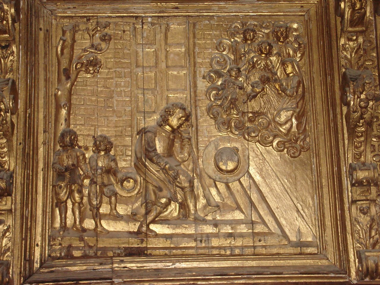 Do lado esquerdo, surge S. Bernardo rezando em frente à porta da Igreja e vendo em sonho o nascimento do Menino Jesus;